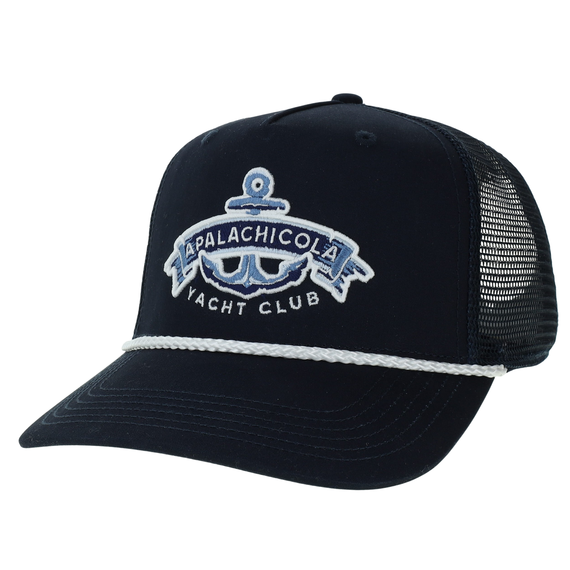 Our all time favorite Roadie cap embroidered with our iconic Apalachicola Yacht Club logo, featuring a sewn on rope accent for that nautical flair. This cap boasts 5-panel deep structured crown, slightly curved visor, and an adjustable open snap black closure.