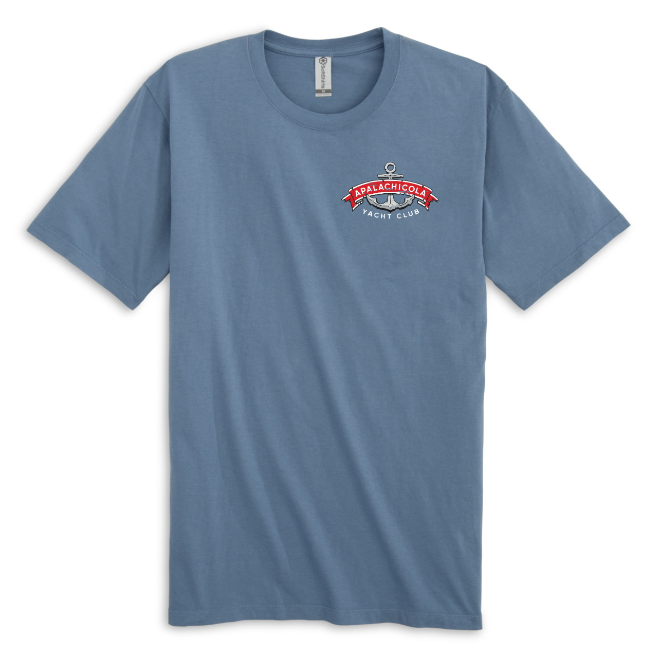 The Flagship Tee features our signature maritime flag design on the back, and is emblazoned with our iconic Apalachicola Yacht Club logo on the front.